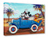 Inspired by Disney's classic sense of fun and adventure, this playful piece captures a carefree Sunday drive through a sun-soaked desert landscape. Mickey and Minnie cruise along in a vintage blue convertible, smiles wide as the warm breeze and open road invite pure joy. Pluto happily tags along, ears flapping and tongue out, adding to the lighthearted scene.